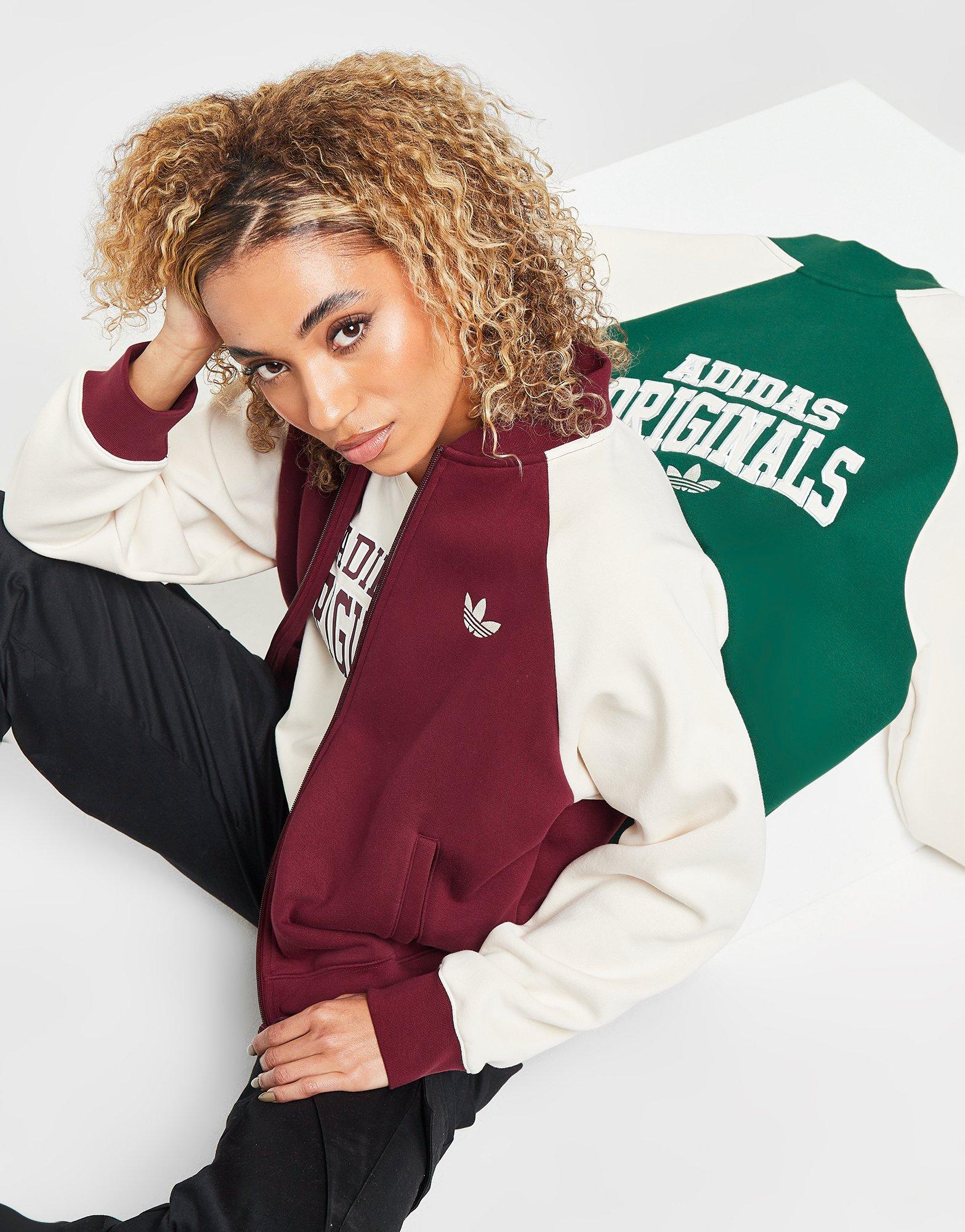 Alege stilul clasic și mizează pe această jachetă Varsity Bomber pentru femei de la adidas Originals. Modelul în culorile bordo și alb, exclusiv la JD este realizat dintr-un amestec de bumbac și poliester reciclat pentru un confort greu de egalat. Prezintă un fermoar pe toată lungimea, are mâneci contrastante cu croială raglan și un guler rotund canelat. Manșetele elastice asigură o potrivire optimă. Are două buzunare în față și este finisat cu logo-ul adidas Originals la spate. De asemenea, este completat cu un logo de dimensiuni reduse pe piept. Produs lavabil în mașina de spălat. | Modelul nostru are 1,70 m și poartă o mărime mică. | IB1655